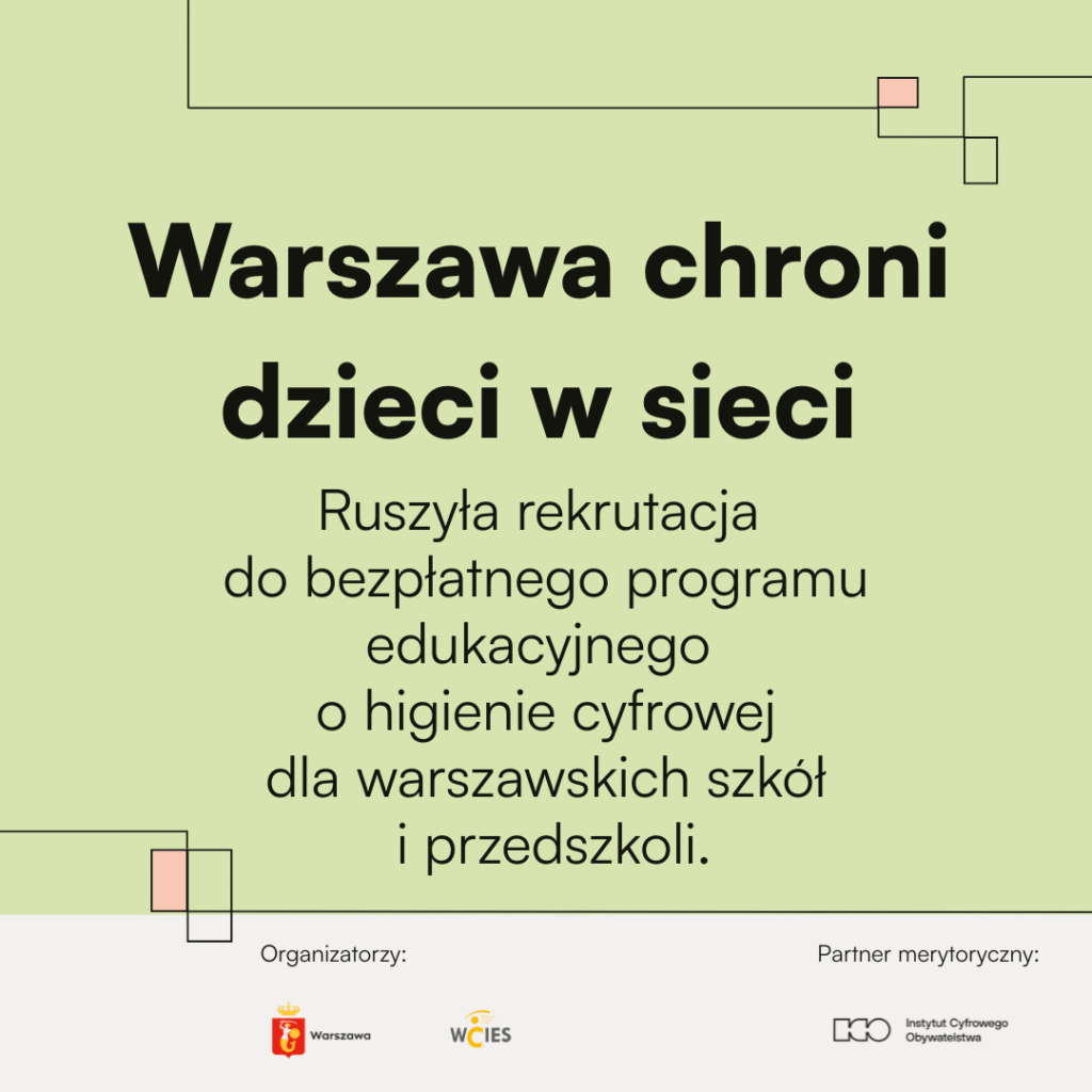Rusza rekrutacja do bezpłatnego programu „Warszawa chroni dzieci w sieci” organizowanego przez Biuro Edukacji m.st. Warszawy oraz WCIES, którego partnerem merytorycznym jest Fundacja „Instytut Cyfrowego Obywatelstwa”.